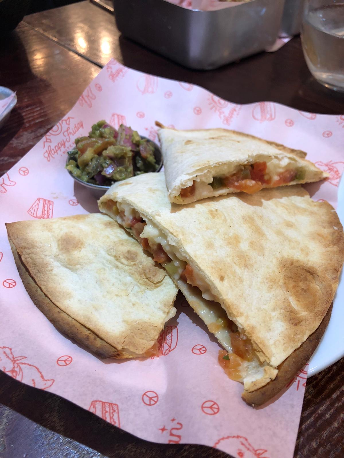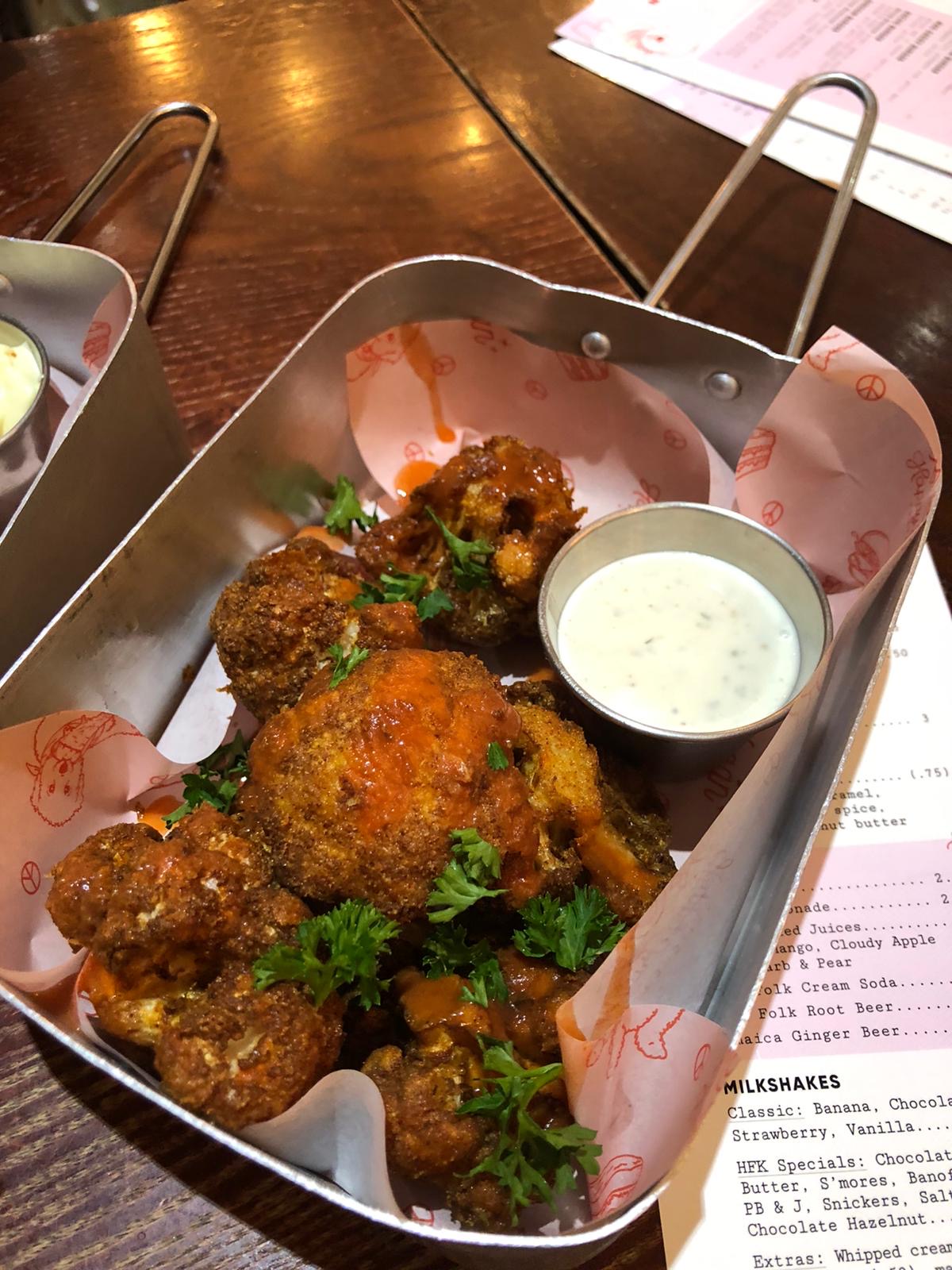 On Lola’s advice, we ordered the side dish of a quesadilla, which seemed a really reasonable price for the size, as it could’ve easily made for a light lunch. A lovely fresh salsa with mild melty mozzarella was sandwiched between two crisp tortillas, then a sprinkling of jalapeños inside added bursts of chilli heat. They also serve a jackfruit version, but I loved it just as it was! We’d also heard from a friend that the buffalo cauliflower was one to try, so we ordered a portion of that, and we weren’t disappointed. The vegetable melts in the mouth, it’s so nicely cooked. It was drizzled with hot sauce for a little bit of a kick, and served with a tangy bleu cheese dip which added a nice contrasting flavour.
