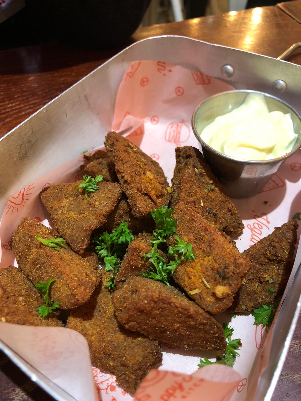 Keeping going with the cheesy deliciousness, we also had to try their mozzarella doughballs, apparently the best-seller of their sides menu. When they arrived, they weren’t what I expected at all – I was thinking Pizza Express style bread doughballs with cheese, but it was more of a deep fried pastry shell. They summed up what’s great about vegan junk food, generously filled with the same cheese as the quesadillas for the most comforting eating experience.