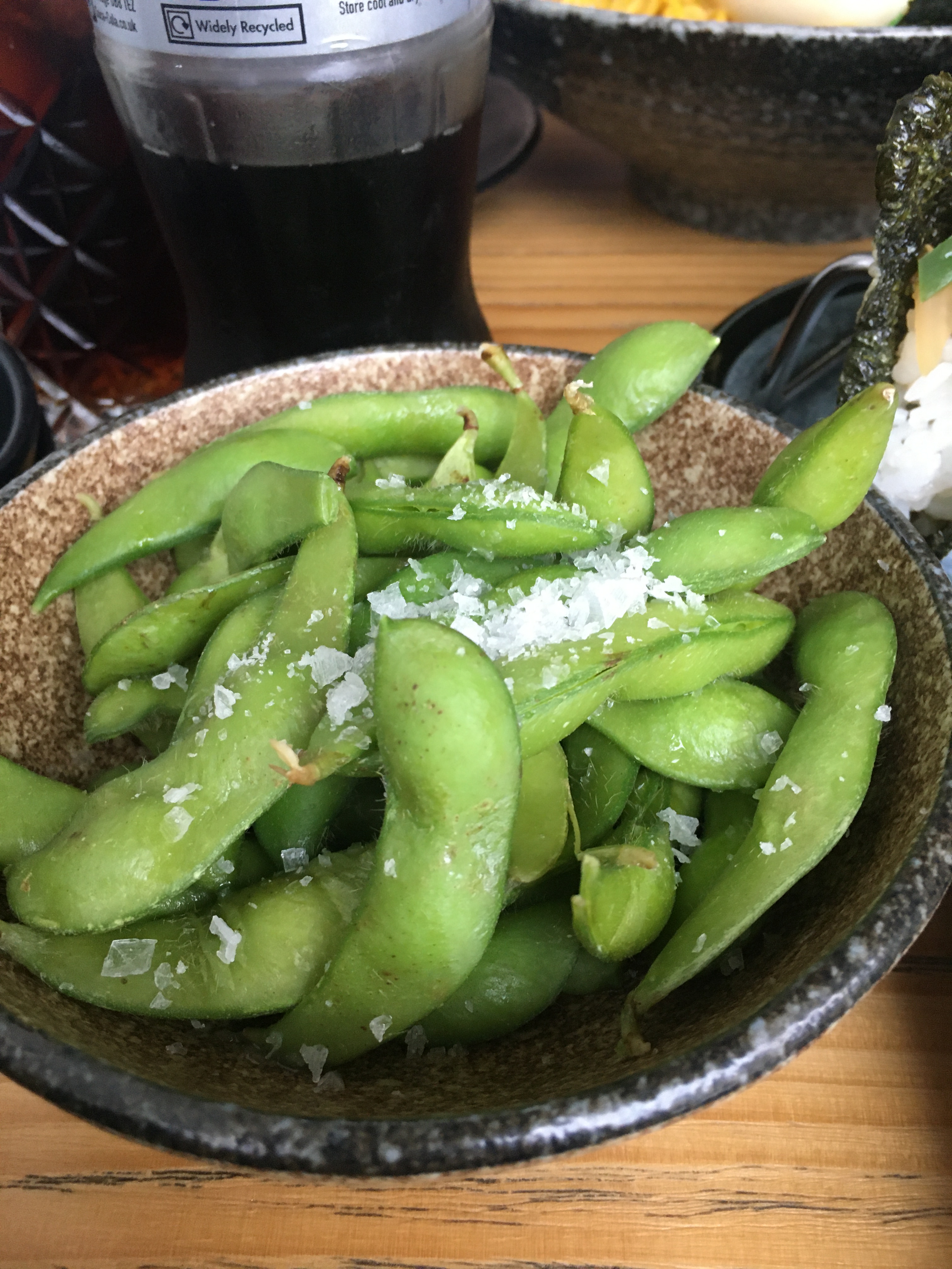 As another couple of little treats on the side, I’d ordered some edamame, served warm and covered generously with sea salt, and inari sushi.