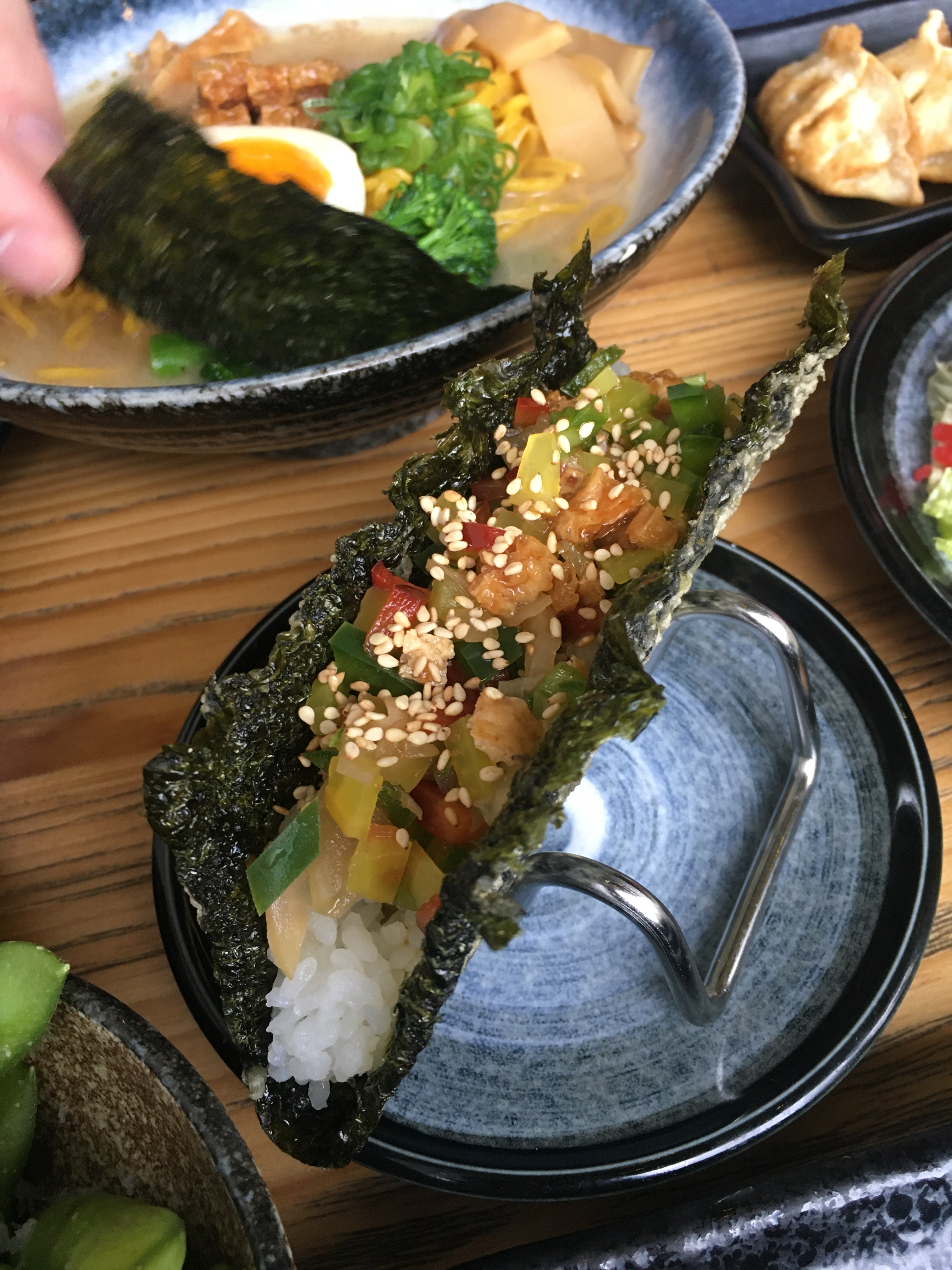 Taberu is one of those restaurants that has existed on Cowley Road, seemingly against the odds, for years. While many other establishments in East Oxford seem to come and go, the Japanese restaurant has been a staple on the food scene here for a long time. So it’s somewhat surprising that I’d never been, and I never really hear anyone talking about it. We took a leisurely walk on the weekend to Cowley Road, and catching a glimpse of ‘vegan taco’ being advertised in their window, we decided fairly spontaneously to go in. I’m so glad we did! I discovered Taberu has a large separate vegan menu, with gluten free also well catered for, and had to restrain myself from ordering every single item on the menu. Still, we had a large spread of food on our table by the time I’d settled on which dishes to order…