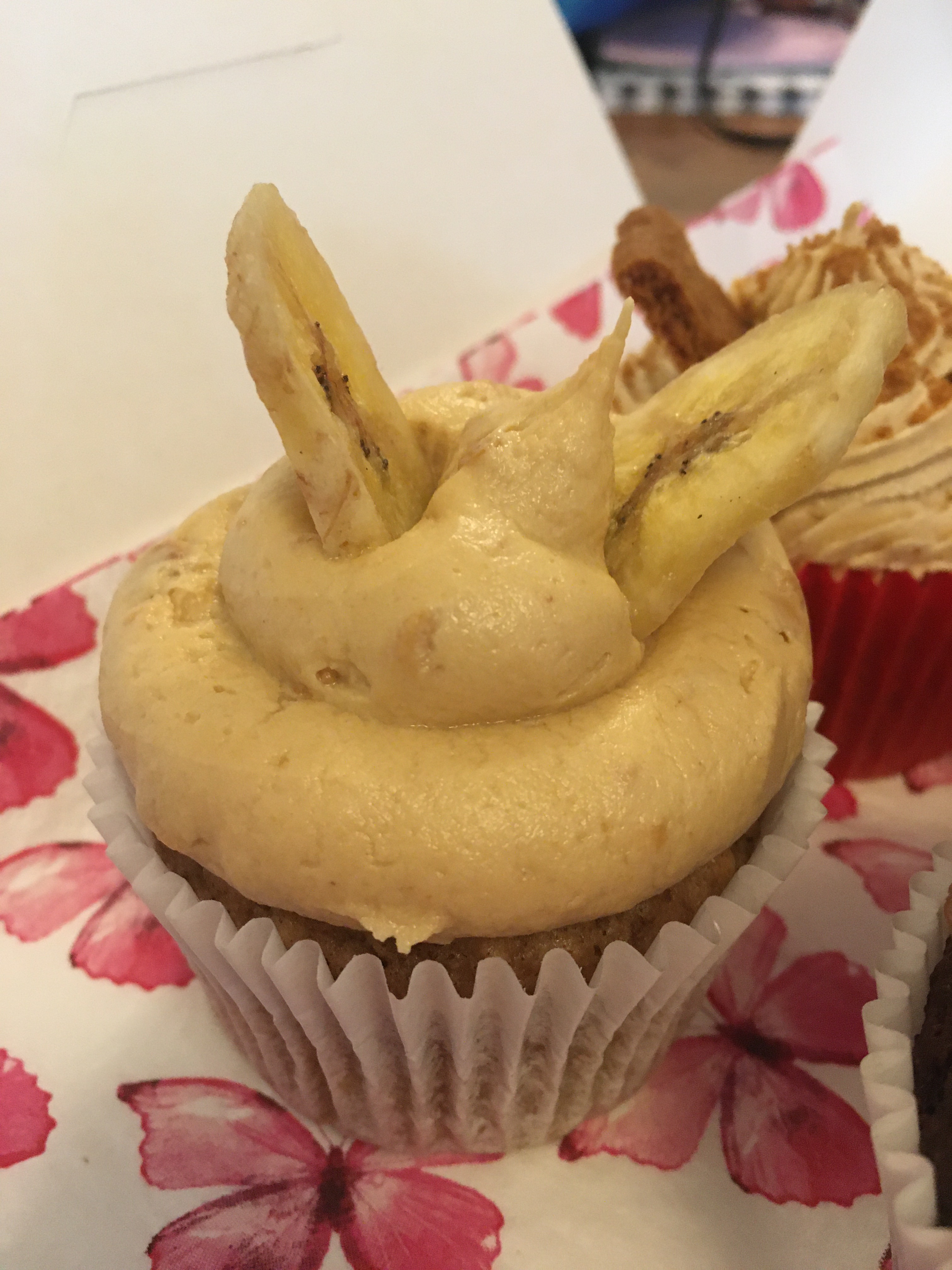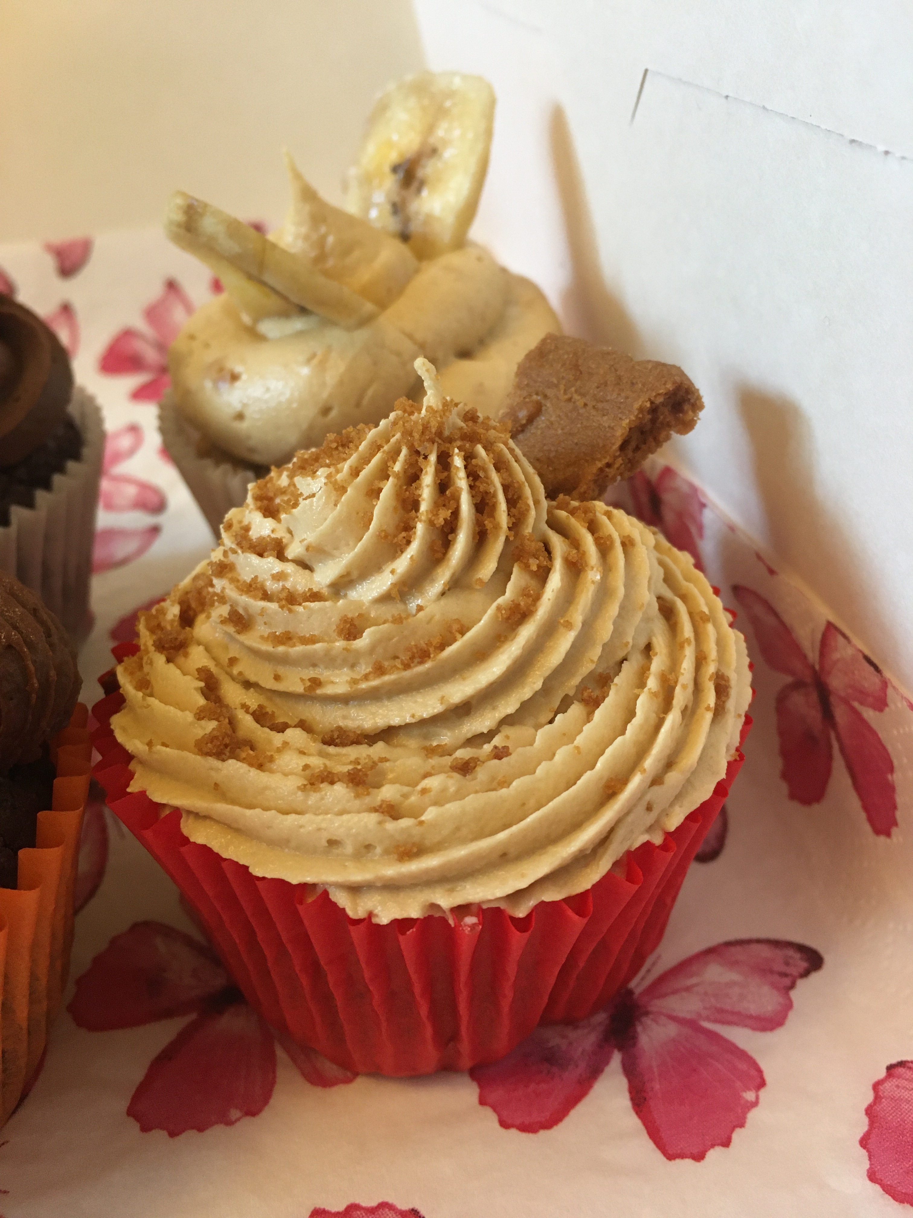 I was so impressed with how well that peanut butter flavour translated throughout every element of the cake, especially as it’s one of my favourite foods. The base was a warming spiced banana muffin, again nicely baked. The muffin itself wasn’t too sweet, which was good with such a sweet icing on top, and the ratio of cake to icing was perfect. You got a hint of saltiness from an oozy peanut butter surprise at the centre of the cupcake, as well as the PB whipped through the icing – the whole thing reminded us of the flavour of Reeses Pieces in cake form. A sprinkling of crushed peanuts on top added a nice crunch to finish off the cake.