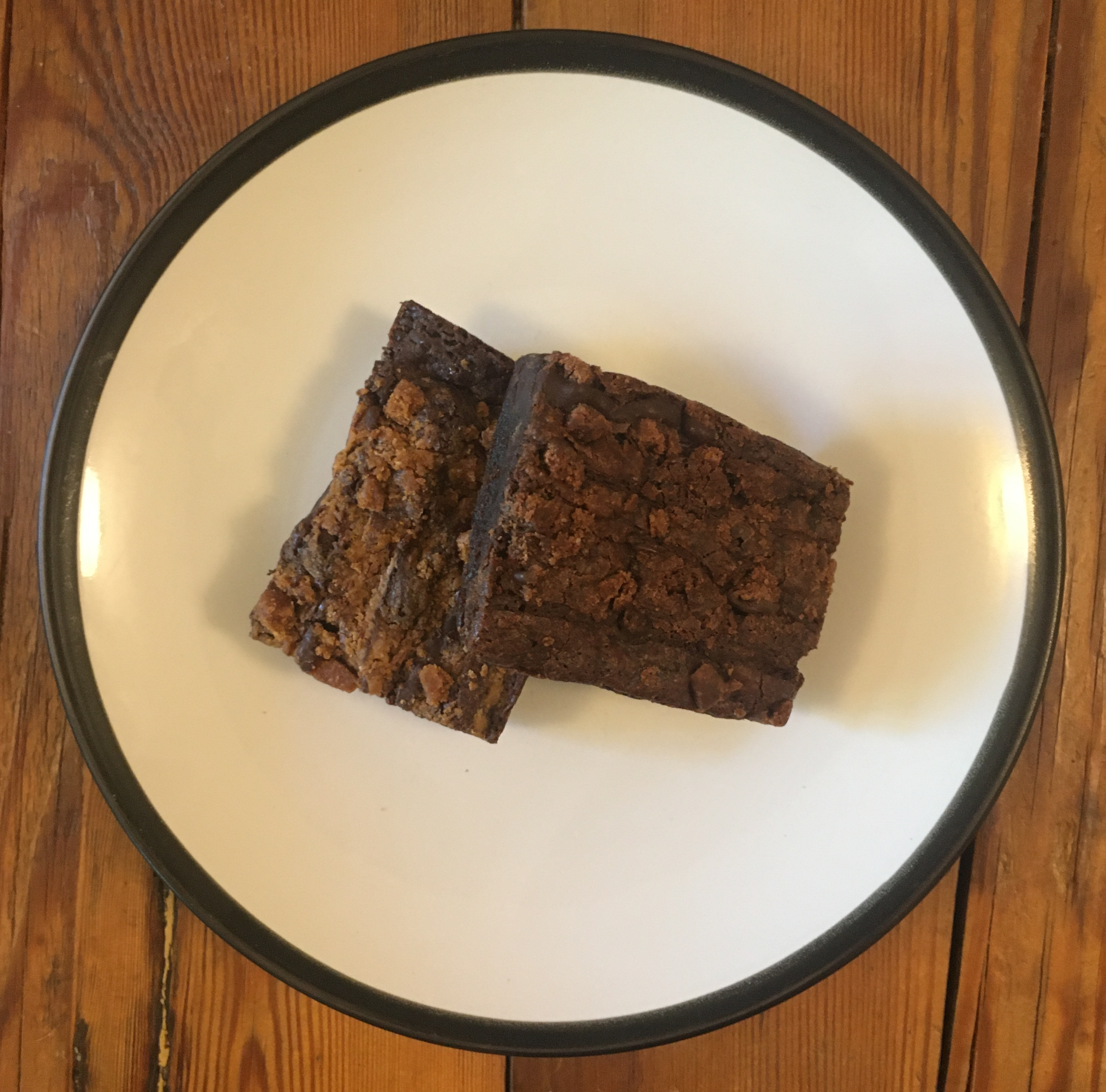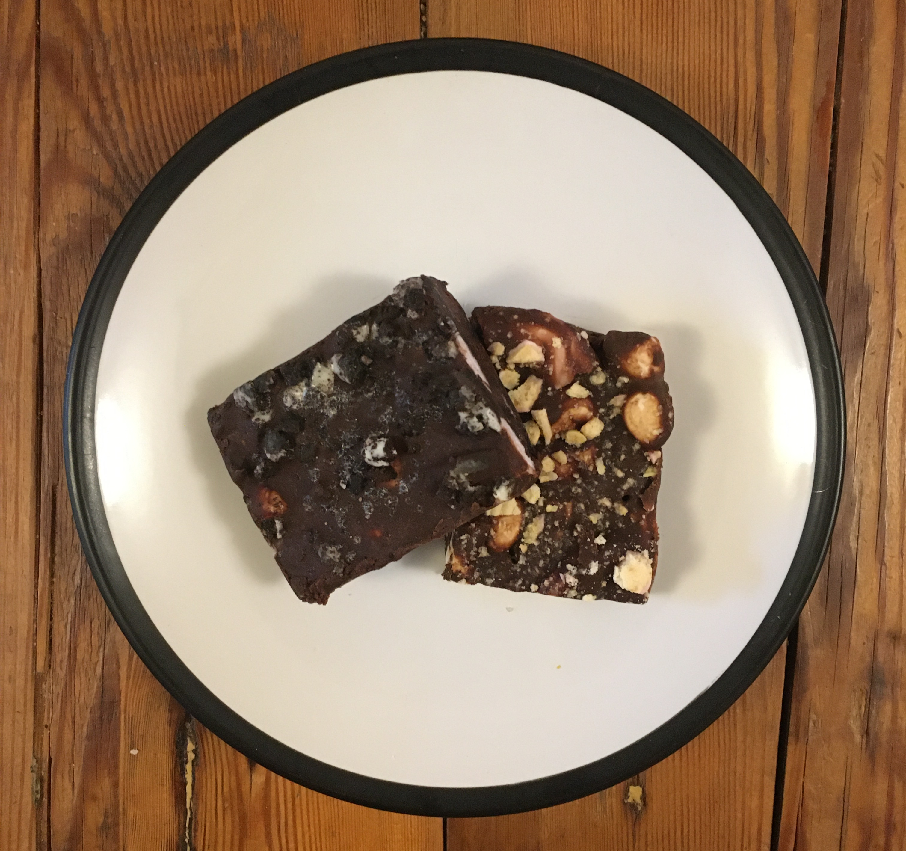 Lastly we tried the rocky roads. These were definitely the most indulgent things in the sample box. Velvety dark chocolate encases marshmallows and biscuits – in one, oreos, in the other, party rings. Both flavours were absolutely packed with fillings. I loved the squishy texture of the marshmallow alongside the bite of the biscuit. You don’t get much of the flavour of the party rings as the chocolate is so rich, but the signature crunch is absolutely there, and I knew what it was instantly without having looked on the website. Although the same size as a brownie, which I had no trouble polishing off in one sitting, I felt on the edge of too full having eaten a whole one of these. They are so sweet and rich, and probably better than any non-vegan rocky road I’ve eaten because they’re happily not faffing about with any dried fruit (perhaps more traditional, but I hate it). The other rocky road flavour we received was oreo, and most of the vanilla filling had melted into the chocolate, making each bite possibly even more creamy and delicious.