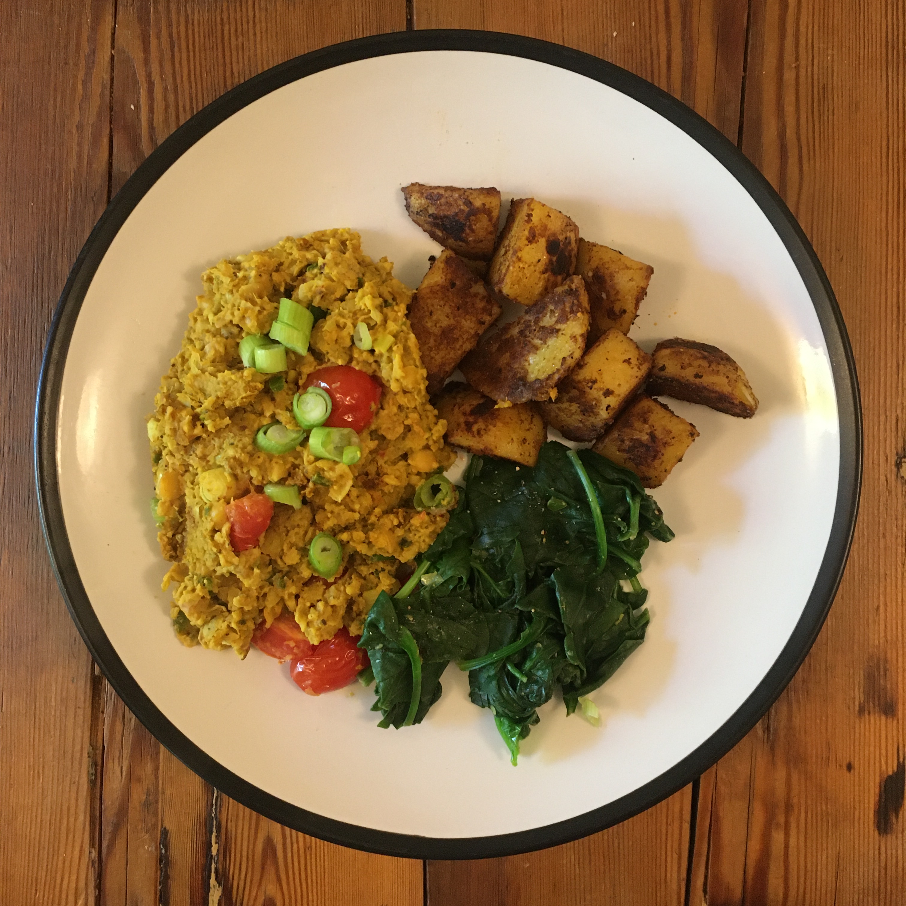 A delicious, filling and comforting brunch dish, one I’d happily make again and is a decent replacement for a weekend plate of scrambled eggs. It’s a really interesting recipe, different from most of the other scrambles out there that I’ve seen, in that it involves mixing a baba ganoush style mixture with your mashed chickpeas and heating through. There’s nothing in the ingredients to make this taste eggy, but the spice mix makes it delicious. I made masala-spiced sautéed potatoes and garlicky wilted spinach alongside it as the recipe recommends. The meal kept me full for hours, just as a proper brunch should.