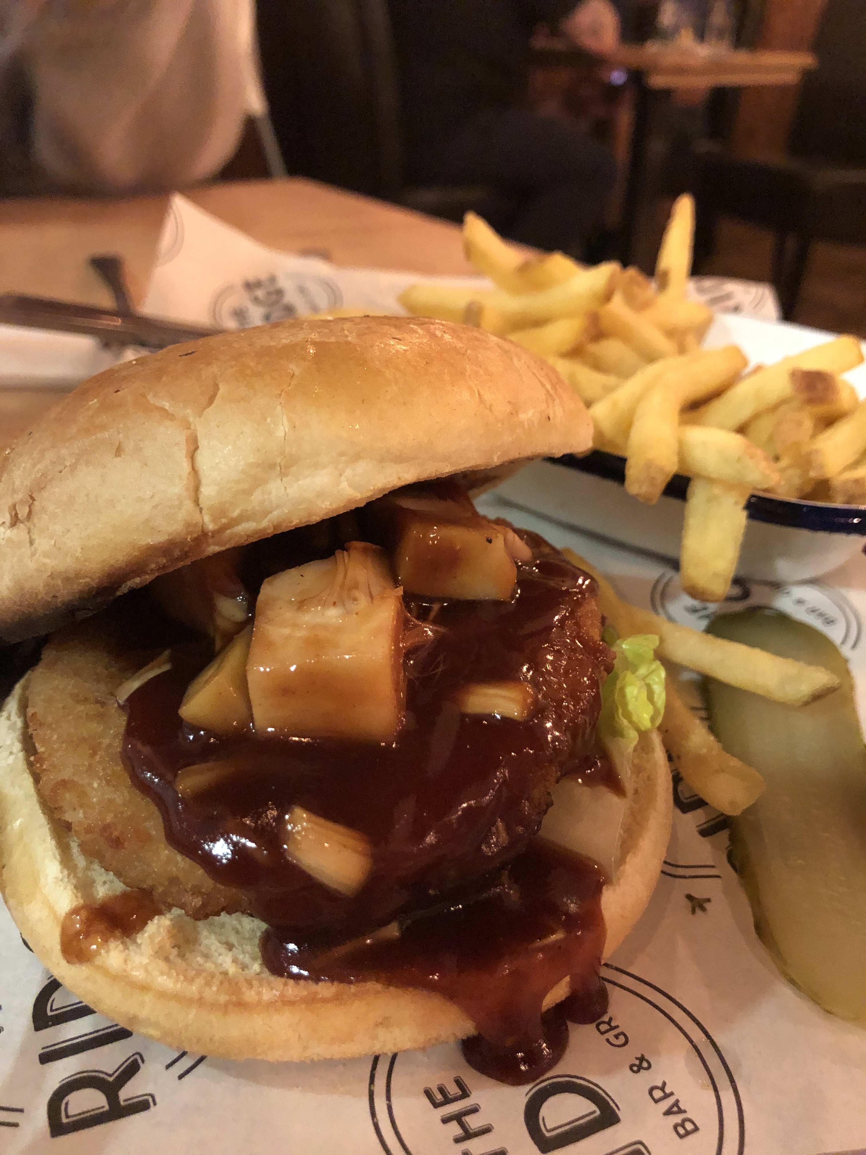 When the pulled jackfruit returned, I almost wished I hadn’t asked. It looked like they’d hastily taken three pieces out of a can, zapped them in the microwave until they could pass as warm, and squeezed half a bottle of barbecue sauce on top. It wasn’t ‘pulled’, and although it was hot it was very firm and somehow didn’t feel cooked. I’d imagined a nice barbecue-style homemade, or at least pre-made, sauce, rather than literally your standard Heinz squeezed out of a bottle. It was way too strong of a flavour. The few pieces of jackfruit sat on top of a chicken-style burger, which was fine. It reminded me of the cheap frozen ones you can get from Aldi, and I could’ve definitely done a better job at creating this burger at home. There was a solitary lettuce leaf in the burger, and the best part of the whole thing was the slice of pickle sitting next to the burger, for some reason.