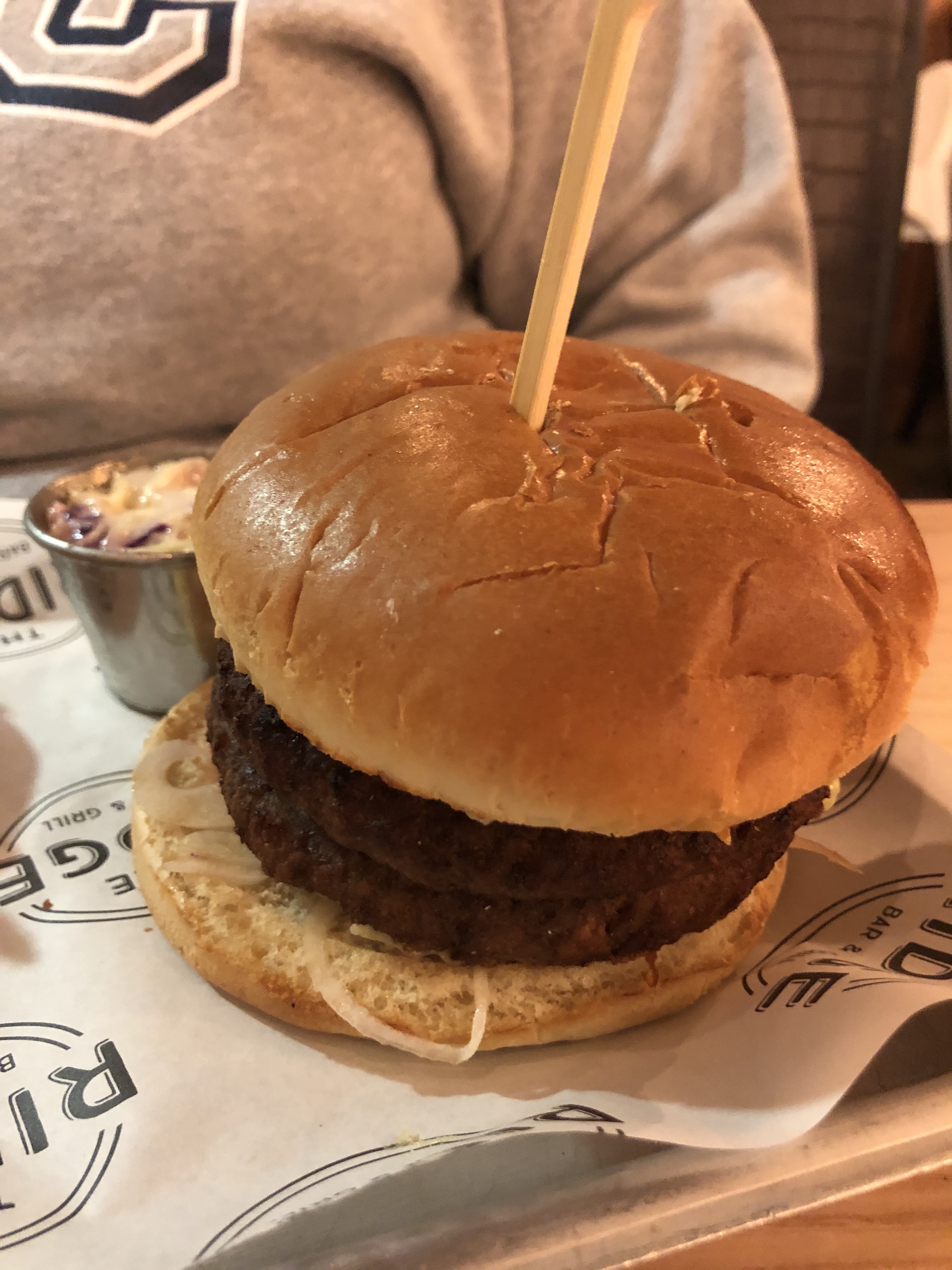 My sister’s cheeseburger was made with a double decker of Moving Mountains patties. You probably all know what the burger tastes like, and there was really nothing else more to it than that. She said it wasn’t too bad compared to my own burger, they’d given a decent amount of vegan cheese and the one that they’re using seemed to melt reasonably well in the burger. She quite enjoyed her cheesy chips on the side as again they’d been generous with the cheeze. I did like the fries too – they were crisp and nicely salted. I’d probably have been happier if I just had a big plate of those! On the side of both of our meals was a little pot of coleslaw. It looked a bit sweaty and neither of us touched it.