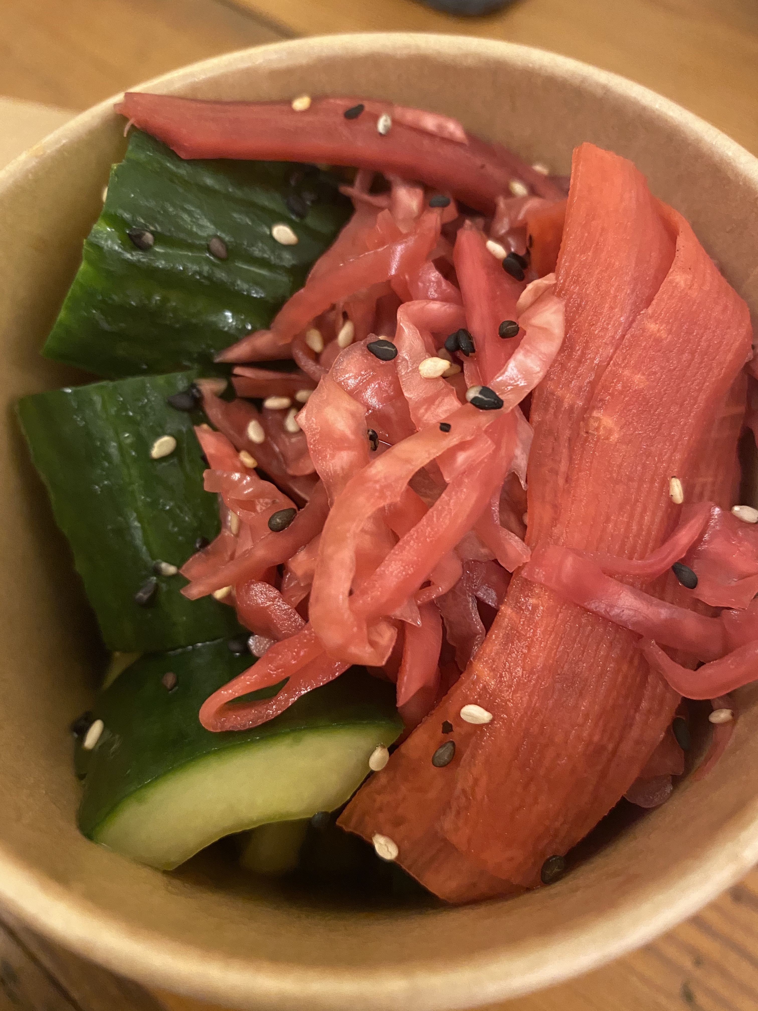 The lovely Fiona of Cranston Pickles set up her venture inspired by a love of her own grandparents’ pickles (something I can relate to actually!) fused with a love for Japan. Fiona had gifted me a few jars of her delicious seasonal pickles and chutney earlier in the year, which I thoroughly enjoyed, so I was pleased to see our house was in the delivery zone for her Friday night ‘Pickled Takeout’. I placed my order earlier in the week and eagerly awaited the delivery. On the day I received an email to confirm a half an hour slot our food would arrive in – conveniently shortly after my live workout class finished.