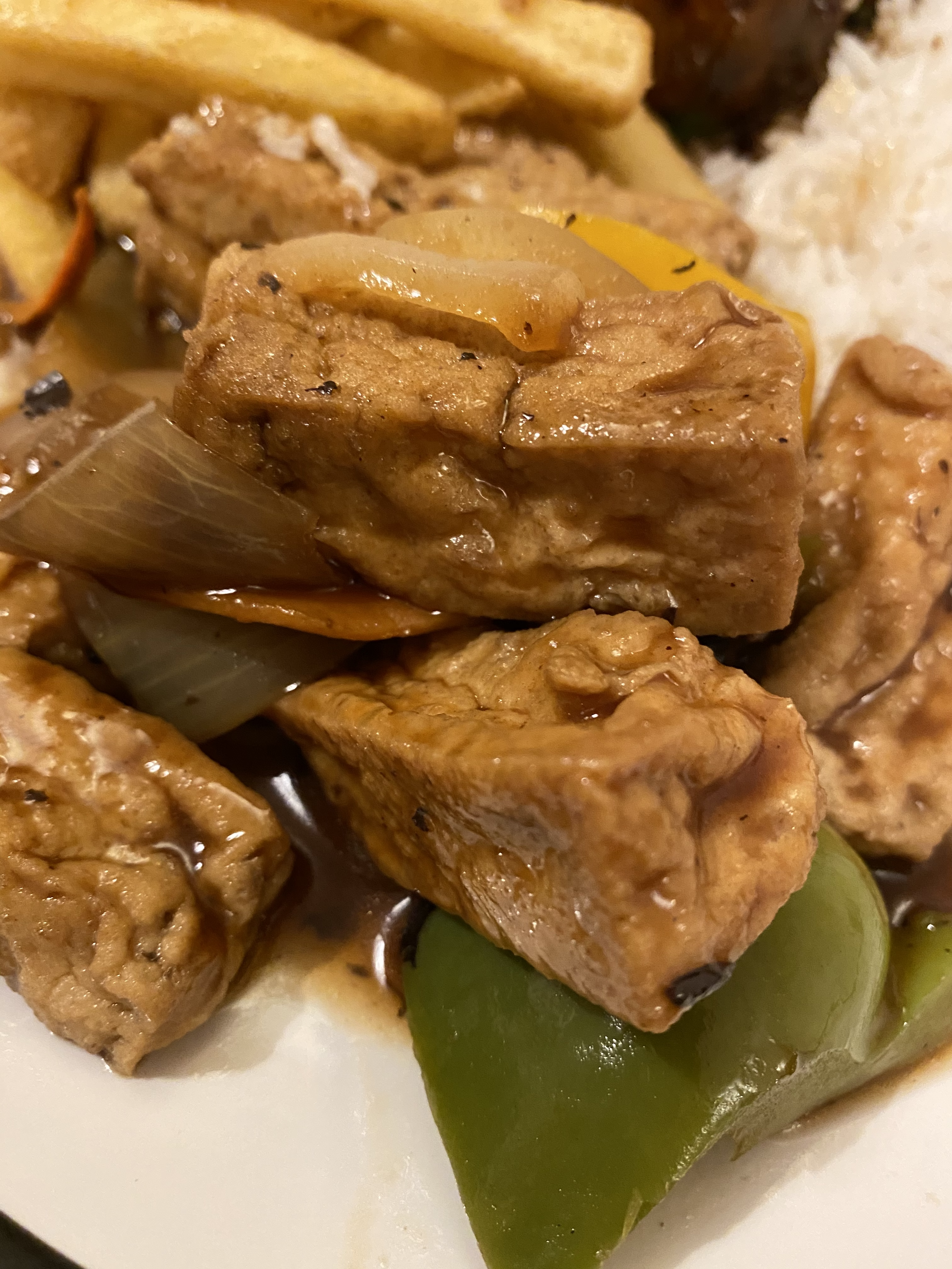 I’d gone for tofu in black bean sauce with boiled rice, which is my staple order so I’ve tried a fair few. The tofu was more similar to stuff I’d cook at home, rather than the puffed tofu pieces you often get, though the texture was still satisfyingly chewy on the outside (maybe they used this freezer shortcut?) and it had absorbed plenty of flavour from the sauce. There were big chunks of crunchy bell peppers in the dish too, enough that I actually thought I might reach one of my five a day, which is fairly unheard of when we order a takeaway. The sauce didn’t pack a huge punch in term of flavour but it was still tasty, not too greasy, and the fluffy rice soaked it all up nicely.