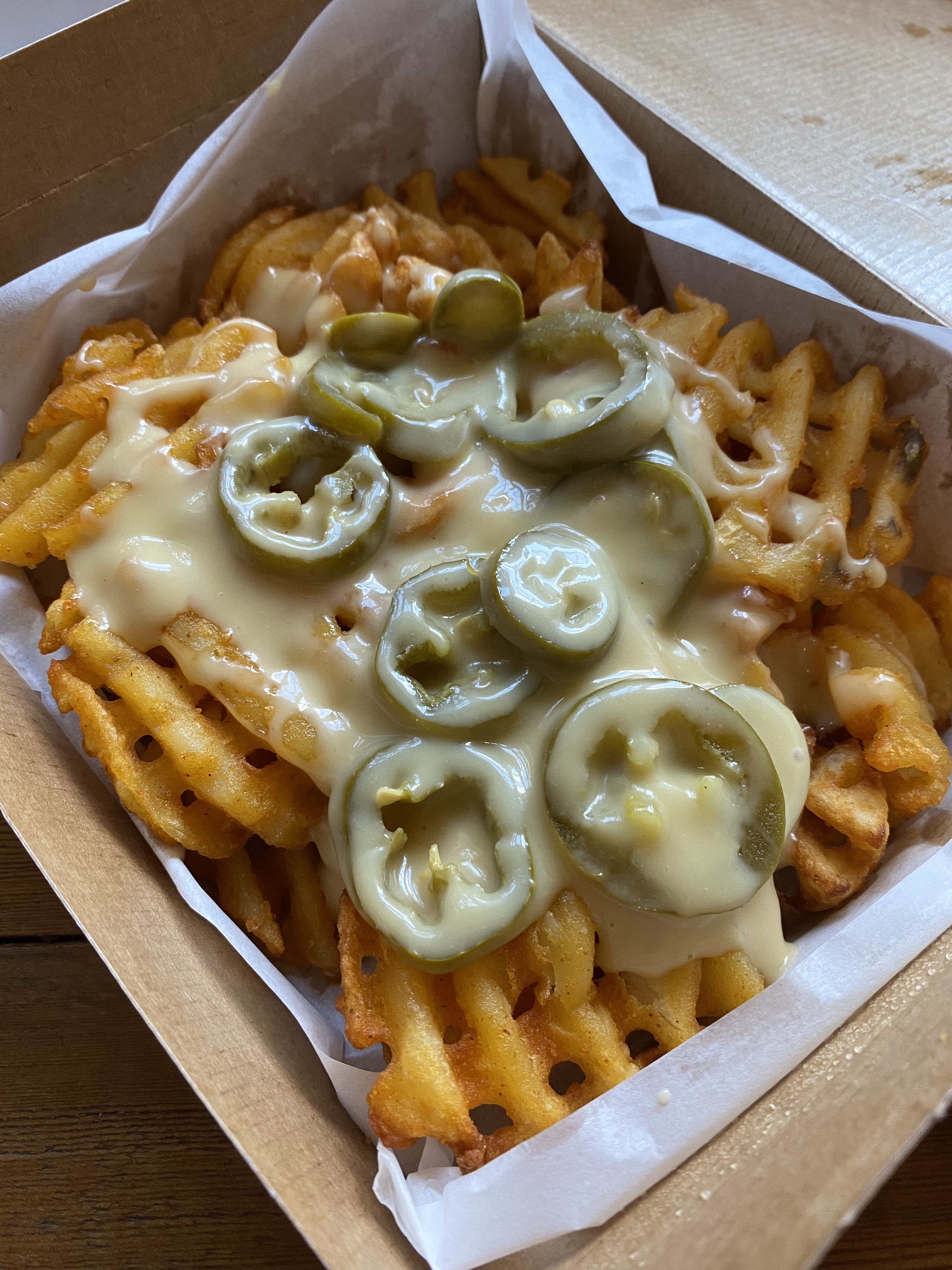 As for the fries – the cheezy loaded waffle fries were probably my favourite part of the meal. Although my plain baked waffle fries had gone cold and were kind of limp and unsatisfying (I think anyone who has eaten at Leon, delivery or in store, has probably experienced this on at least one occasion), the loaded fries were much nicer. For less than £1 extra, you get a reasonably bigger portion, and a pot of gooey cheese sauce with jalapeños to smother the potato with, kept separately to maintain the quality of everything. The pot looked a little small but once I’d poured it over everything it looked like just the right ratio. The cheese sauce also had jalapeños swimming in it so you had bursts of heat every so often that were really enjoyable. The only downside was that we were supposed to get a pot of Leon’s vegan aioli with it, which didn’t arrive, but we always keep our fridge stocked with sauces so it wasn’t really a problem.