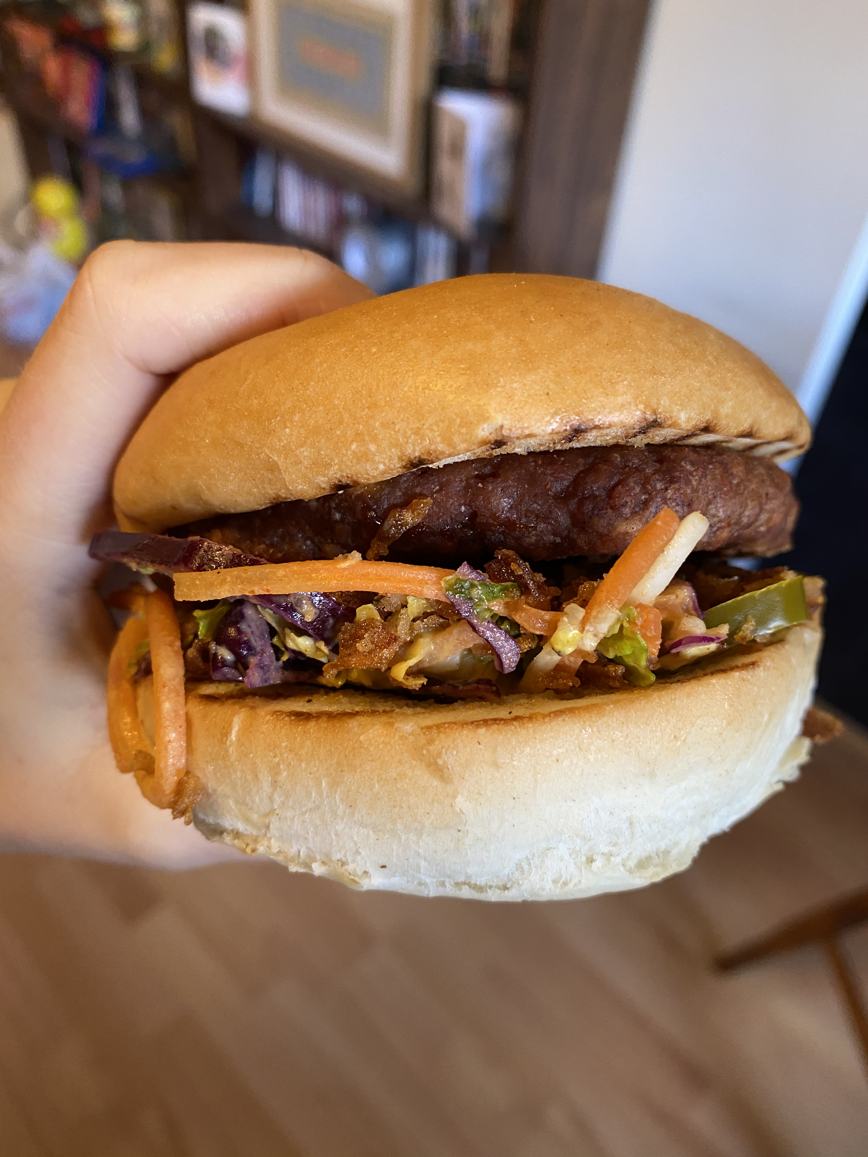 Having tried Leon’s LoVe burger previously, I wanted to give a few of their other burgers a try. There are three chick’n burgers and three beef style on offer. First up, we tried the ‘Better than Mex’, a chicken style patty with smashed avocado, jalapeños, cheeze and crispy onions. Except, the cheese was missing from mine, sadly, and I feel like that would’ve made a real difference. As a result, what I received was a bit disappointing. The chick’n patty didn’t have too much flavour, though at least in terms of texture it had a decent chew to it and held everything together with all of the more liquid burger toppings. The avo portion wasn’t particularly generous, and with this burger actually being pretty spicy from the chilli sauce and peppers, I felt it could’ve done with a bit more of that cooling element.