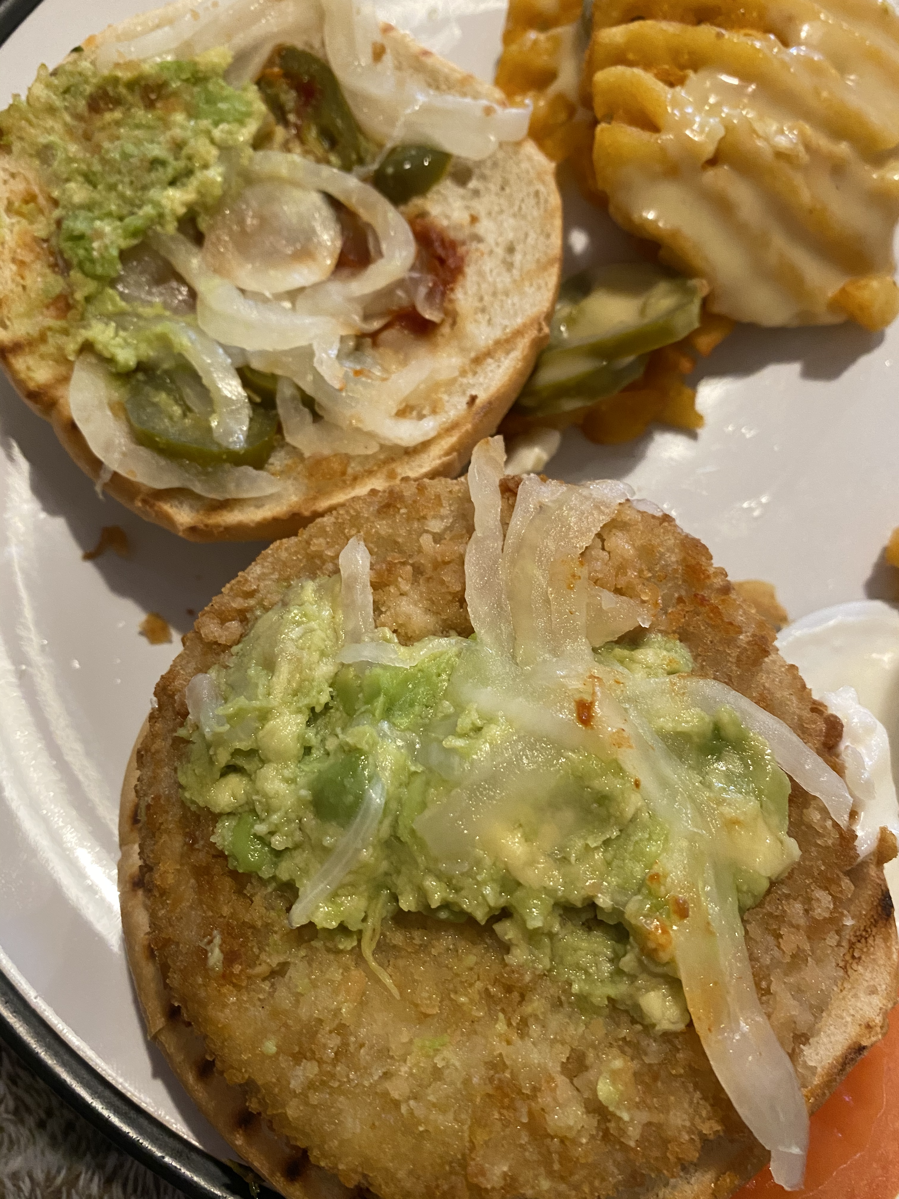The next burger we tucked into was the ‘Herby, fully loaded’, the chick’n patty again but this time assembled with Middle-Eastern flavours. I still couldn’t say much for the flavour of the patty, particularly as the other flavours in this burger were quite strong! It comes with chilli sauce, sumac pickled onions and zhug. The heat from the spices was more mellow than in the Mexican burger, with a strong, Earthy herby sauce. I really liked the tang from the pickled onions which lifted the whole thing up. It was an interesting burger and I often find that high street chains like to err on the safe side and offer very familiar flavours, so it was nice to try something a bit different.