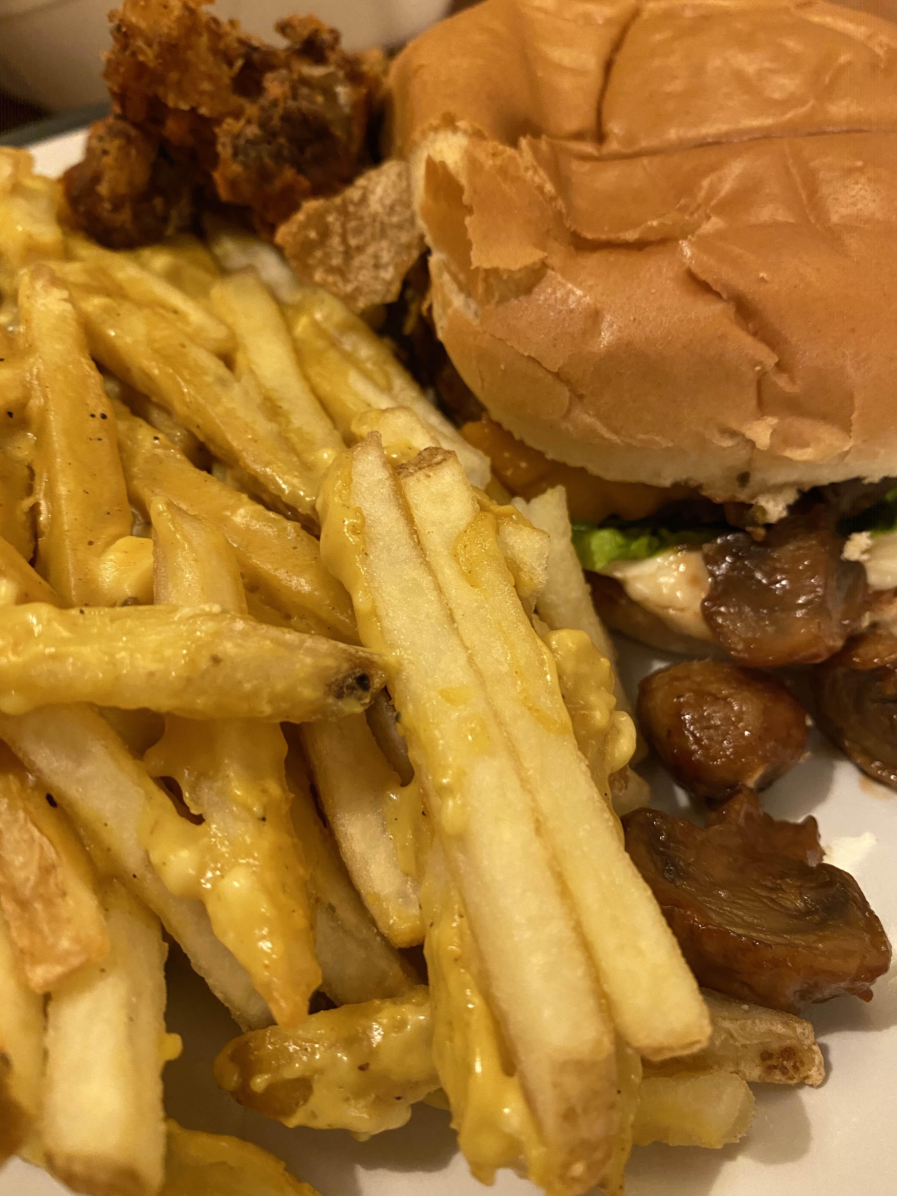 Jamie opted for the Shroom Burger, a Moving Mountains patty topped with creamy barbecue mushrooms. The patty was nicely cooked, as you’d expect from a vegan restaurant, and the addition of garlic mayo and American style cheese make for a really great burger. I stole a bite because anything with creamy mushrooms is a winner in my book, and it was indeed very tasty. The thinly cut fries on the side were smothered in the queso-style cheese, which you can upgrade to for £1.50. The bright yellow colour looks a bit unnatural (not sure if there is such a thing as natural cheese dip?) but the salty, cheesy sauce definitely goes down well.