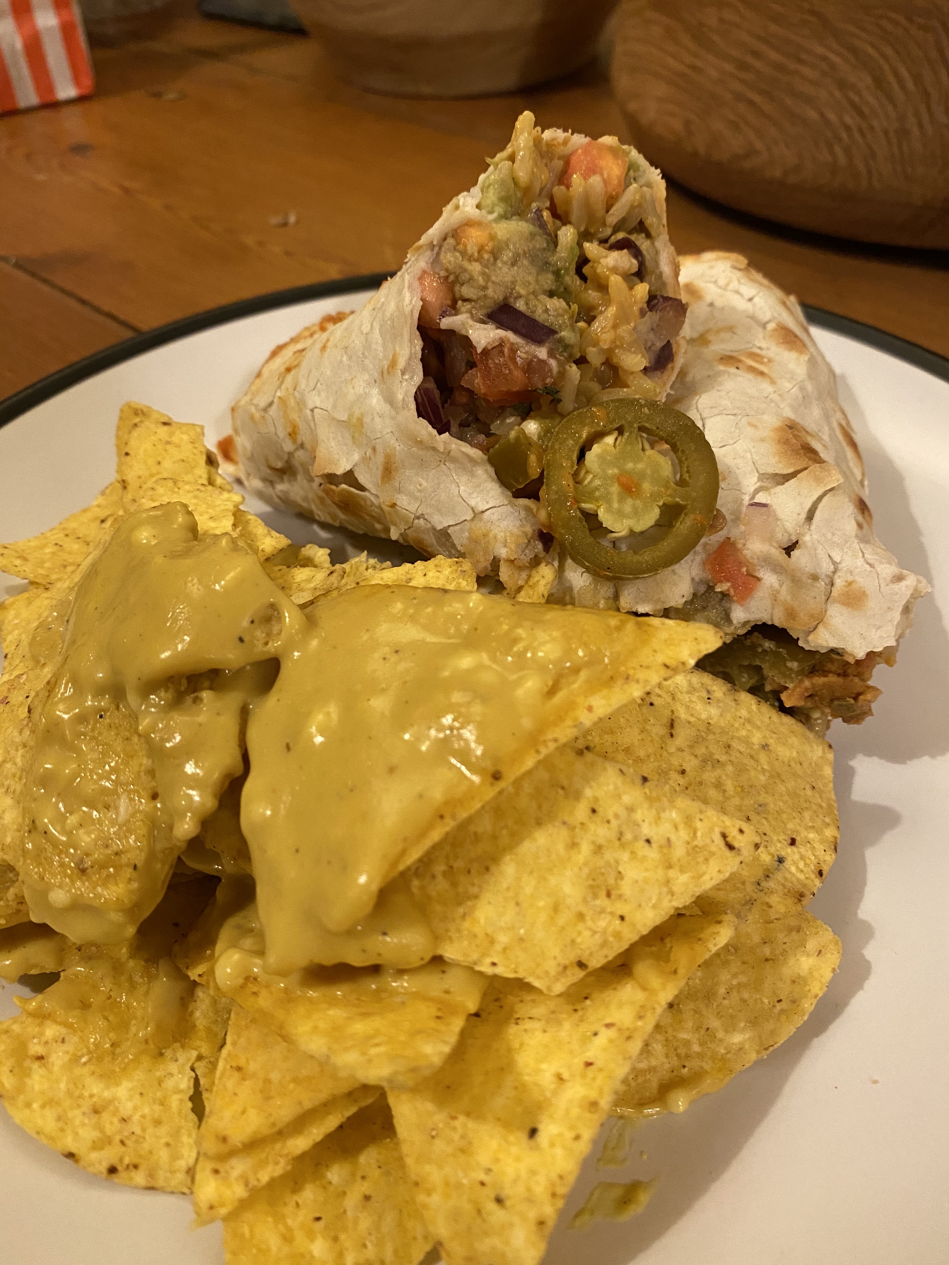 I ordered the burrito, which came with a side of tortilla chips. I really enjoyed the chunks of their signature homemade seitan found throughout the burrito, probably actually more-so than if I’d had it in a burger as one huge patty. The wrap was packed full of filling, and it wasn’t just bulked out with rice, there was a generous amount of smokey, spicy ‘meat’ mixture in there. The wrap had managed not to go soggy in transit, and the burrito was soft but still had a crunch from fresh tomato and raw onion. It had a decent heat to it too from jalapeños hidden throughout, though the spice was cooled down with creamy avocado. It was a delicious and filling meal: home-cooking style comfort food without the effort of having to make it yourself.