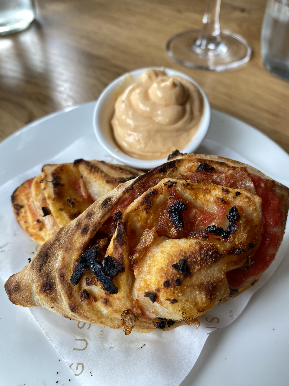 The bottomless brunch slot lasts for 90 minutes, and the drinks are free-flowing – they didn’t seem to worry whether we’d finished our previous cocktails before taking our order for the next one, and the staff were the right level of attentive. We didn’t have to wait long for our starters to arrive either, Gusto’s signature dough petals. Make sure to request the vegan option, which comes with a shallot and tomato filling, with vegan mayo on the side. The dough petals were soft and pillowy, and a delight to eat. I would’ve probably preferred a vegan garlic ‘butter’ on the side like the non-vegan version, rather than a mayonnaise, but it’s a minor point – these were super tasty and a great start to the meal. The portion size was ideal, just enough to whet the appetite and get you looking forward to your main course.