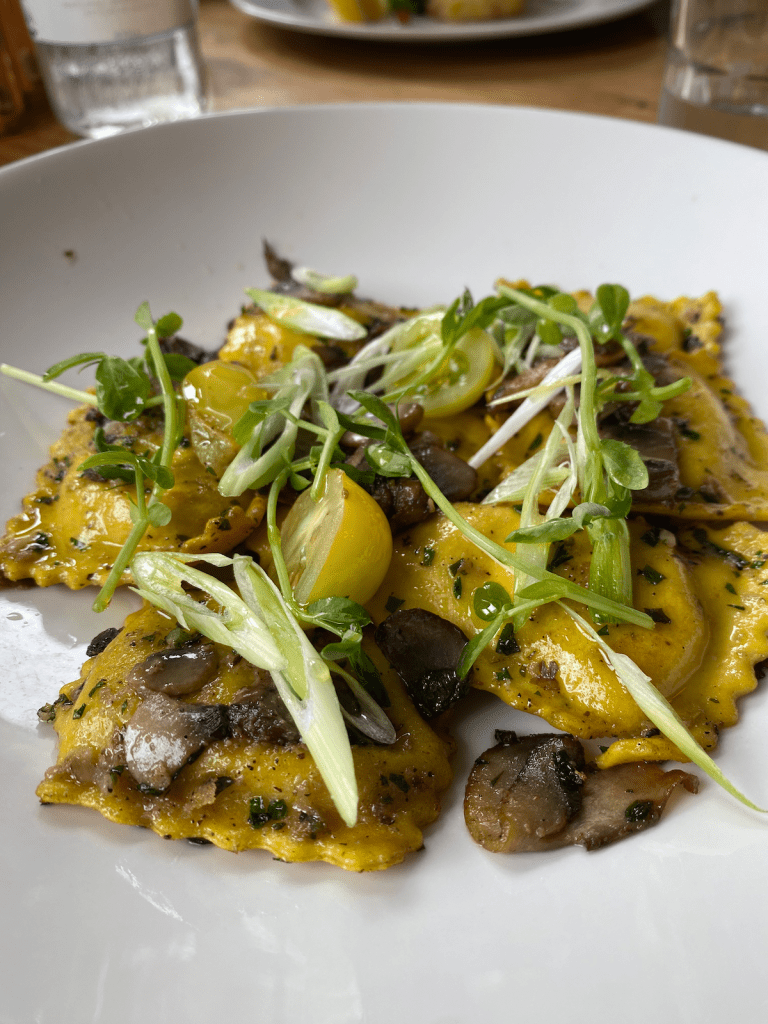 For the food, you can choose from a small selection of dishes from the main menu, with a few plant-based options in there (as long as you’re a fan of pasta, you’ll be okay). I opted for the artichoke and wild mushroom ravioli. When they put the bowl down in front of me, there was a mild scent of truffle, not too overpowering. I was pleasantly surprised to see that there was a decent amount of ravioli in the bowl, as sometimes you can feel a bit short-changed when it comes to filled pasta in restaurants. The pasta itself was bursting with flavour, packed with earthy Jerusalem artichoke which paired so well with the meaty mushrooms scattered across the dish. Sweet tomatoes burst in the mouth and although there wasn’t a sauce, this along with a drizzle of oil prevented it from going dry. Everything was well seasoned, and the dish was finished off with spring onion which added a freshness, so it didn’t feel too heavy. I’m not sure what the pasta was made of, perhaps chickpea flour – it was cooked al dente and was perhaps slightly chewier than regular wheat pasta, but I still enjoyed the texture and it was honestly one of the best restaurant dishes I’ve eaten out in a while.