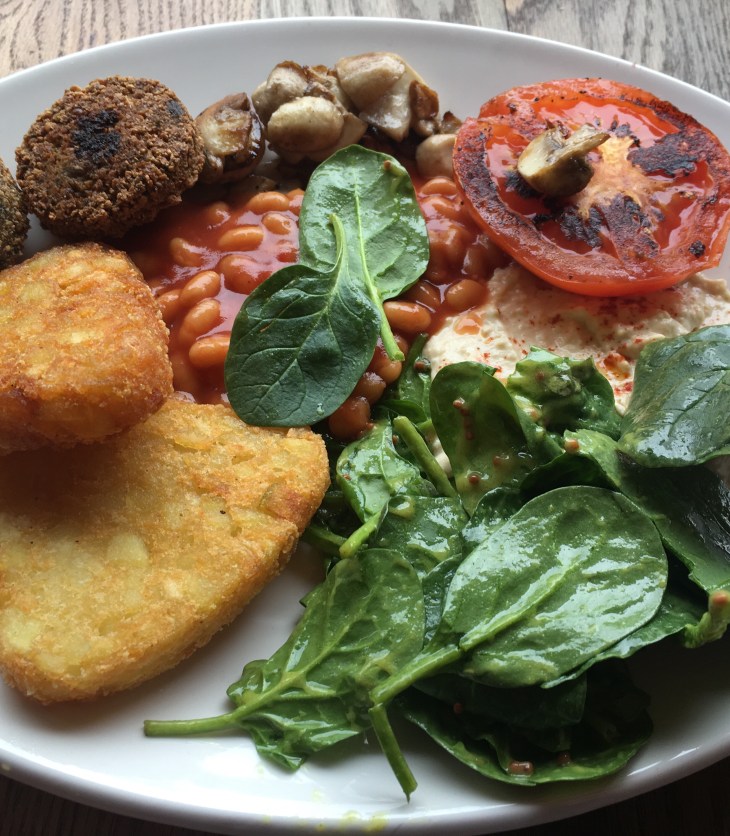 The vegan breakfast itself was delicious and incredibly filling, particularly great value for the price. This has got to be the go-to place for any veggie students with a hangover this term! A big plate with falafel, beans, mushrooms, hash browns, houmous, spinach, and a tomato, are served with a portion of toast on the side.
